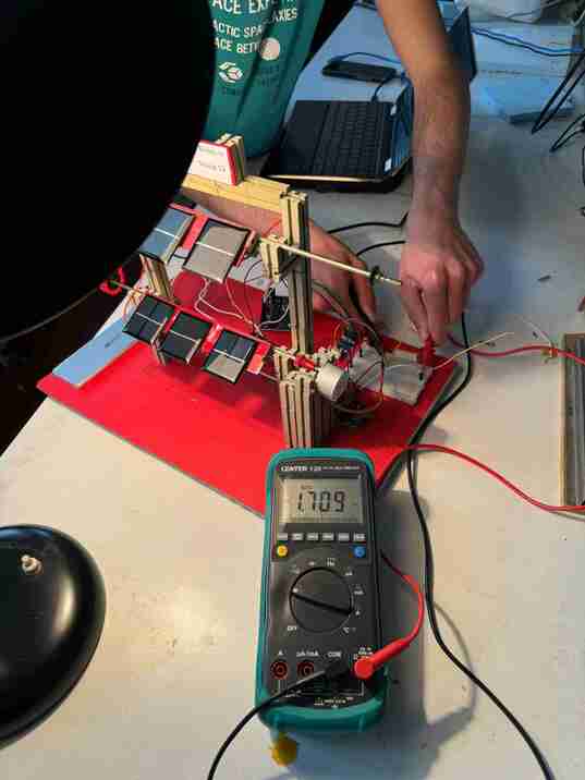 We are thrilled to announce the successful completion of our project! After a week of rigorous testing, our prototype is now functioning exactly as we initially envisioned. Throughout this period, our team conducted numerous tests to ensure the product’s seamless and user-friendly operation. Although we faced challenges with testing the power production in daylight due to unfavorable weather conditions, we successfully assessed the power output of our solar panels using an incandescent light bulb, as shown in the image below.